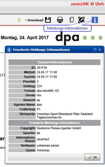 Neben den Standardinformationen bieten z.B. newsML-G2 Formate noch weitere Merkmale. Je nach Nutzung dieser Merkmale werden diese in den Erweiterten Meldungsinformationen aufgelistet: