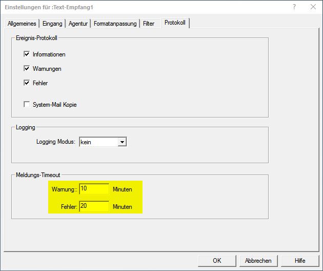 Unter "Meldungs-Timeout" kann die Zeitspanne für Fehler und Warnung angegeben werden, nach der das Ausbleiben von neuen Meldungen protokolliert werden soll. Eine Eingabe von "0" deaktiviert die entsprechende Überwachung.